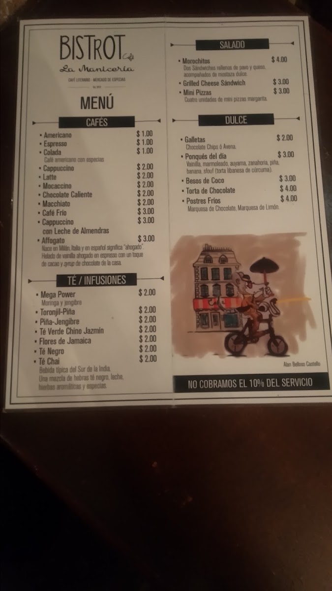 The menu at Bistrot Café - La Manicería is a delightful showcase of culinary creativity. Indulge in the rich flavors of the decadent chocolate cake, a must-try that has left patrons spellbound, often described as 'delicious' by satisfied guests. Complement your sweet treat with their signature iced coffee, crafted to perfection to provide a refreshing burst of flavor. The salty snacks, though simple, are remarkable in their delightful zest, offering the perfect accompaniment to your vibrant beverage of choice.
